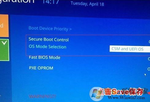3、關(guān)閉安全啟動(dòng)后,BOOT選項(xiàng)中就會(huì)多出一個(gè)OS Mdoe Selection選項(xiàng),我們將默認(rèn)的UEFI OS改為CSM OS或CSM and UEFI OS,如下圖所示;