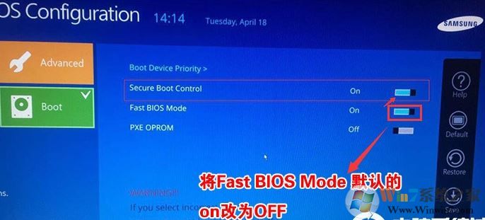 4、將Fast BIOS Mode后面的開關(guān)關(guān)掉(On變成Off),如下圖所示;