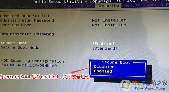 1、重啟筆記本按delete進(jìn)入BIOS設(shè)置,在Security下把Secure Boot Control設(shè)置為Disabled,關(guān)閉"安全啟動(dòng)"如下圖所示,然后按F4保存更改重啟,如圖: