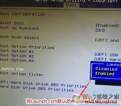 3、再將launch csm設(shè)置為Enabled,開(kāi)啟兼容模式,如下圖所示,然后再F4保存設(shè)置,如圖: