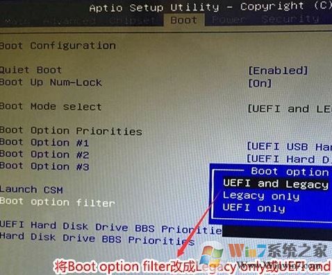 2、重啟后再按delete,進(jìn)入選擇Boot選項(xiàng),將Boot option filer回車設(shè)置成legacy only或uefi and legacy,如圖: