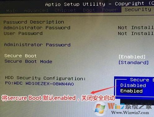 1、重啟筆記本按delete進(jìn)入BIOS設(shè)置,在Security下把Secure Boot Control設(shè)置為Disabled,關(guān)閉"安全啟動(dòng)"如下圖所示,然后按F4保存更改重啟,如圖: