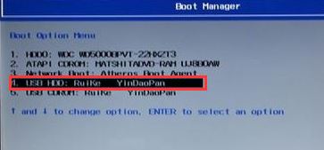 5、插入U(xiǎn)盤啟動(dòng)盤,重啟時(shí)不停的按下f12,打開Boot Manager,選擇USB HDD回車從U盤啟動(dòng),如下圖所示;
