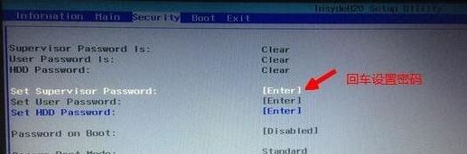 2、如果Secure Boot灰色無法設(shè)置,則轉(zhuǎn)到Security,選擇Set Supervisor Password回車設(shè)置密碼,再返回BOOT選項(xiàng),將Secure BOOT默認(rèn)enabled為disabled,(注:改完secure boot后再設(shè)置密碼為空即可,要不每次進(jìn)BIOS都要設(shè)置)如下圖所示;
