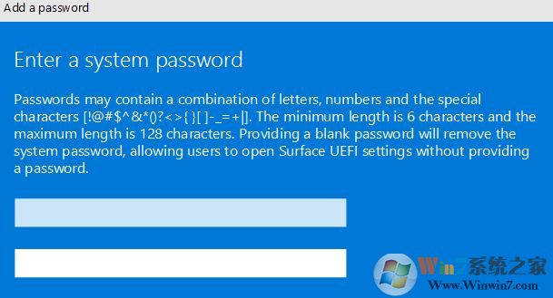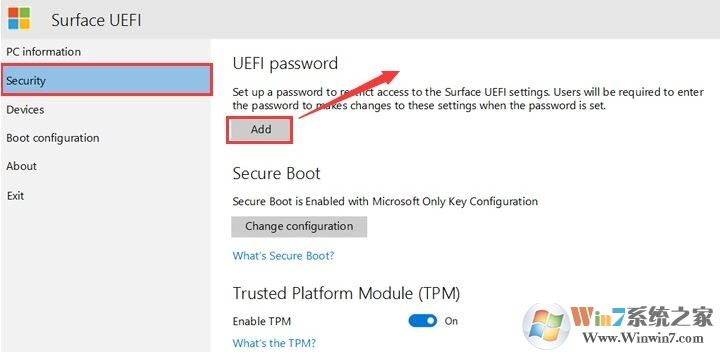 2、進(jìn)入BIOS界面后,我們首先往下移到security(安全選項(xiàng))上,在右側(cè)的uefi password增加密碼,在將 Surface 設(shè)備啟動(dòng)到 UEFI 時(shí),必須輸入此密碼。 密碼可包含以下字符:大寫字母:A-Z 小寫字母:a-z 特殊字符: ! @# $%^ & * () ? <>{}[]-_ = + |。,;: '"密碼必須最少為 6 個(gè)字符,并且區(qū)分大小寫,如下圖所示;