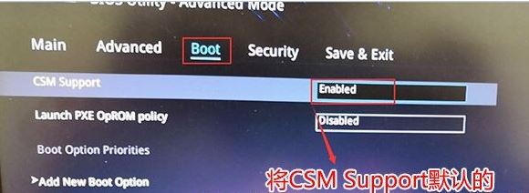 3、再切換到BOOT的選項(xiàng),把CSM support由disabled改成enabled,開啟兼容模式,如下圖所示;