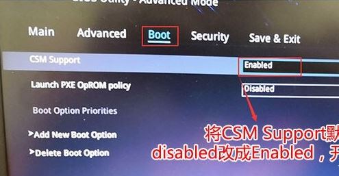 3、再切換到BOOT的選項,把CSM support由disabled改成enabled,開啟兼容模式,如下圖所示;