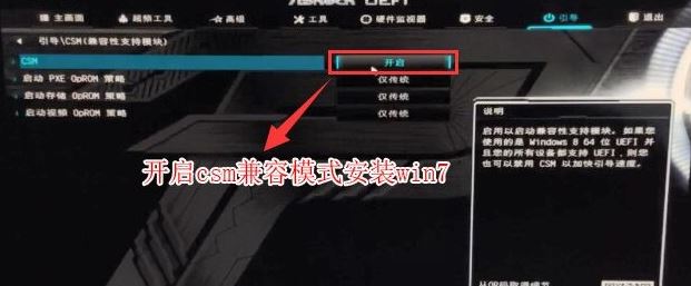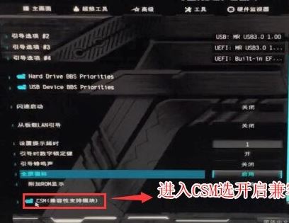 3、再鍵盤方向鍵右鍵切換到"引導(dǎo)"選項(xiàng),進(jìn)入csm菜單開啟“兼容模式”,如下圖所示;