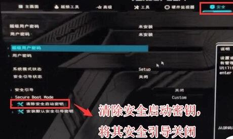 2、按鍵盤方向鍵右鍵切換到"安全"選項(xiàng),選擇下面的“清除安全啟動(dòng)密鑰”將其關(guān)閉安全啟動(dòng)安裝win7,如下圖所示;