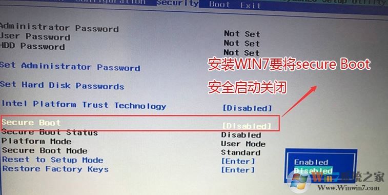 2、按→方向鍵切換到Security,選擇Secure Boot回車設(shè)置成Disabled,關(guān)閉安全啟動,這里一定要記得關(guān)閉,如圖: