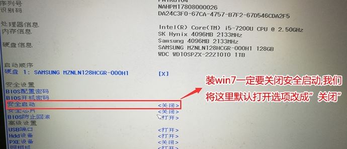 3、選然后我們再將鍵盤往下移動,將安全啟動(Secure Boot)由默認的打開(enabled)狀態(tài)改成關(guān)閉(disabled),如下圖所示: