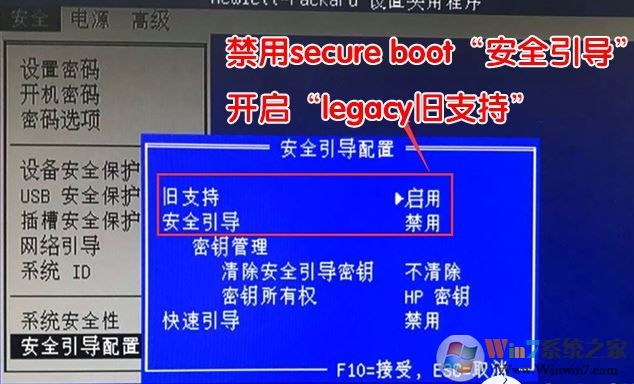 2、進入后先更改Secure Boot—disable(禁用安全啟動),再更改Legacy Support—enable(再開啟舊支持),更改完成后按F10保存,如下圖所示;