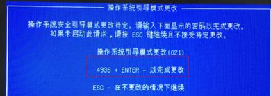 5、主機(jī)自動(dòng)重啟,開機(jī)顯示操作系統(tǒng)引導(dǎo)模式更改,中間有四個(gè)隨機(jī)數(shù)字加回車,例如下圖:4936+ENTER,需要敲擊顯示的四個(gè)數(shù)字后按Enter鍵,否則之前更改的信息無(wú)法保存。(敲擊數(shù)字前需要確認(rèn)小鍵盤是否已開啟,開啟后再敲擊,或者請(qǐng)按大鍵盤字母上面的一排數(shù)字鍵輸入);