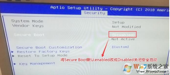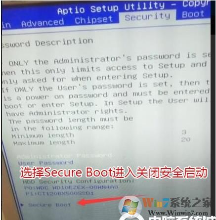 3、然后按鍵盤方向鍵右鍵切換到Security選項,選擇Secure Boot進入安全設(shè)置選項,然后進入后將Secure Boot默認的enabled改成disabled關(guān)閉安全啟動,這項一定關(guān)閉,否則安裝win7后進入不了系統(tǒng),如下圖所示;