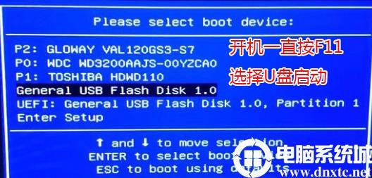 6、插入U盤啟動盤,重啟不停的按F11,選擇識別到U盤啟動項(默認有uefi U盤啟動和傳統(tǒng)模式,這里記得要uefi啟動的就要制作支持uefi的U盤啟動),回車,如下圖所示;