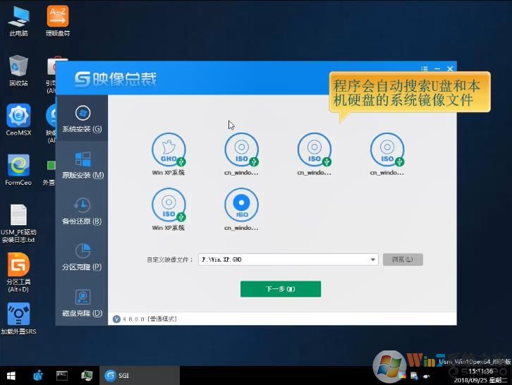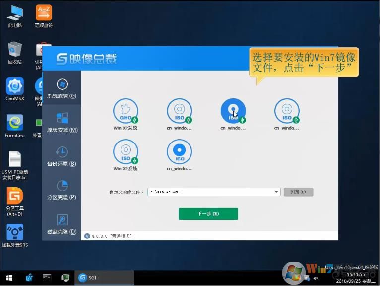 2、打開映像總裁后,軟件會(huì)自動(dòng)搜索U盤和本機(jī)磁盤的鏡像文件(優(yōu)先顯示U盤里的鏡像文件),選擇事先準(zhǔn)備好的Win7系統(tǒng)鏡像文件,點(diǎn)擊下一步;