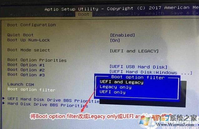 2、重啟后再按delete,進(jìn)入選擇Boot選項(xiàng),將Boot option filer回車設(shè)置成legacy only或uefi and legacy,如下圖所示;