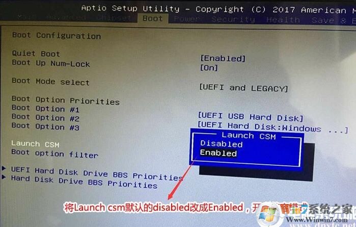 3、再將launch csm設(shè)置為Enabled,開啟兼容模式,如下圖所示,然后再F4保存設(shè)置;
