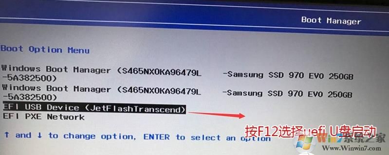 2、用鍵盤上的方向鍵將光標(biāo)移動到U盤啟動項,也就是USB選項,這里一定要注意選擇帶efi或uefi開頭的U盤才能進入,如下圖所示: