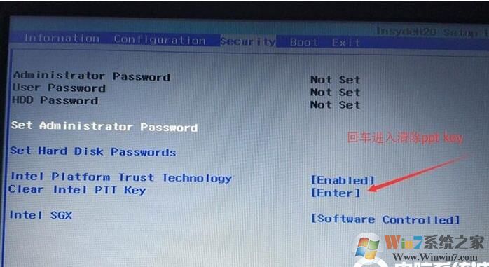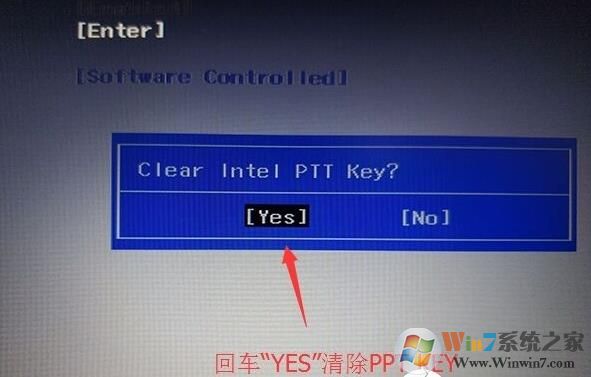 注:按如果Security選項(xiàng)下沒(méi)有Secure Boot選項(xiàng),看下是否有"clear intel PTT Key"選項(xiàng),如果有進(jìn)入回車(chē)選選擇“yes”清除ppt key,否則無(wú)法安裝系統(tǒng)后無(wú)法引導(dǎo)啟動(dòng),如下圖所示;