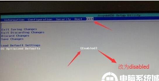 2、轉(zhuǎn)到Exit選項(xiàng),把OS Optimized Defaults設(shè)置為Disabled或Other OS,意思是支持其它操作系統(tǒng),如下圖所示;