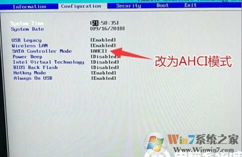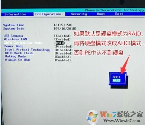 6、注意:再返回configuration這項(xiàng),查看sata controller mode這項(xiàng),如果默認(rèn)硬盤(pán)模式為RAID或RST模式,請(qǐng)將硬盤(pán)模式改為AHCI模式,否則進(jìn)PE后不能認(rèn)出硬盤(pán),如果更改后記得按F10保存,如下圖所示;