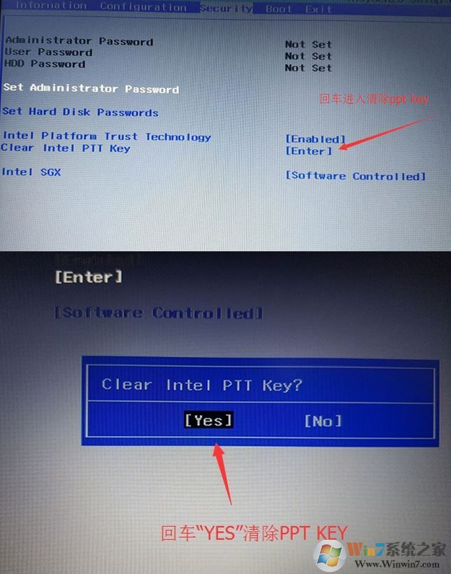 注:按如果Security選項(xiàng)下沒有Secure Boot選項(xiàng),看下是否有"clear intel PTT Key"選項(xiàng),如果有進(jìn)入回車選選擇“yes”清除ppt key,否則無法安裝系統(tǒng)后無法引導(dǎo)啟動(dòng),如下圖所示;