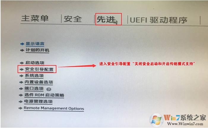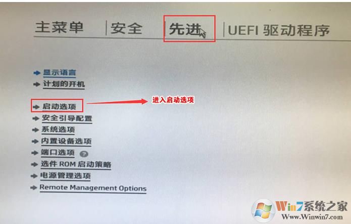 5、F10保存重啟后再次開機(jī)按ESC,然后選擇F10進(jìn)入BIOS設(shè)置,將鼠標(biāo)移動(dòng)“先進(jìn)”選項(xiàng)中,選擇"啟動(dòng)選項(xiàng)"后回車進(jìn)入,如下圖所示;