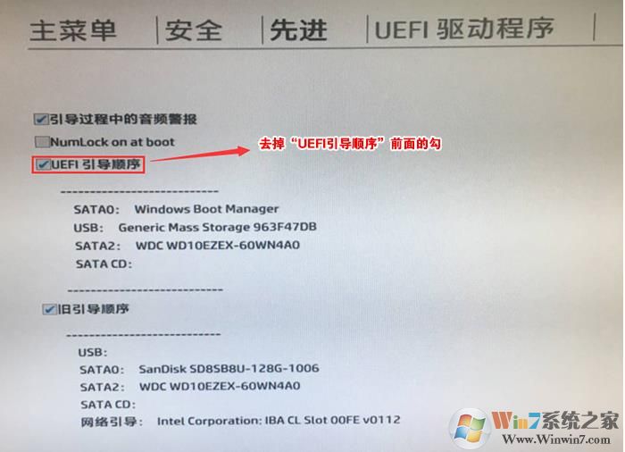 6、進(jìn)入后將UEFI順序前面的勾去掉,讓機(jī)器默認(rèn)為傳統(tǒng)啟動(dòng),這樣方便安裝WIN7,如下圖所示;