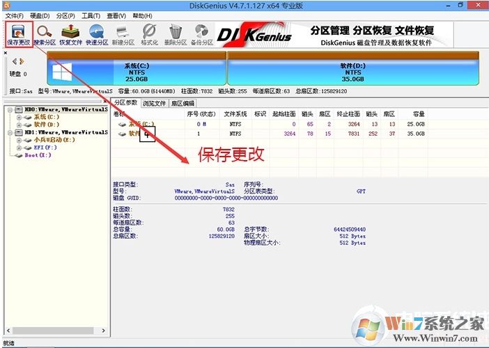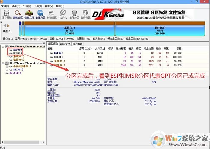 4、分區(qū)完成后可以看到ESP和MSR分區(qū)代表GPT分區(qū)完成,如下圖所示;