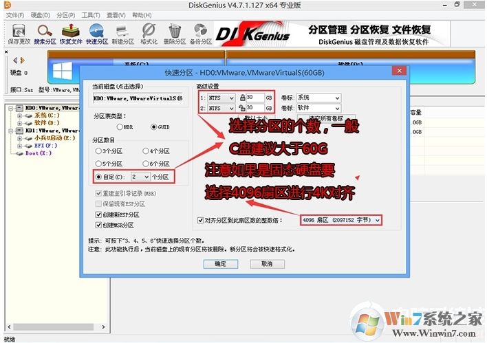 3、在彈出的【快速分區(qū)】界面,我們這里選擇好分區(qū)的類型GUID和分區(qū)的個(gè)數(shù)以及大小,這里一般推薦C盤大小大于60G比較好,然后注意如果是固態(tài)硬盤要進(jìn)行4K對(duì)齊,如下圖所示;