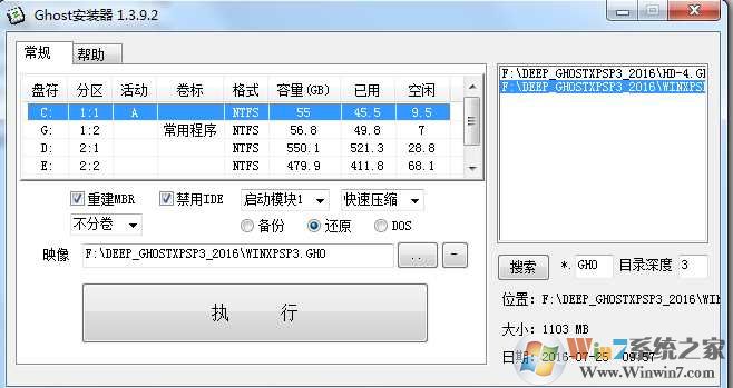 3、參考下圖的設置方法,核對后點擊【執(zhí)行】; 選中 GHO文件,選擇C盤,活動分區(qū)A