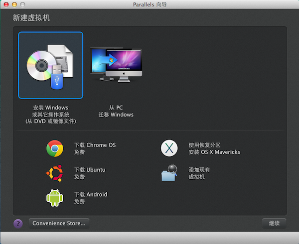 1、運(yùn)行Parallels Desktop 9 for Mac ,進(jìn)入“新建虛擬機(jī)”向?qū)?,提供兩種系統(tǒng)安裝模式:“安裝Windows或其它操作系統(tǒng)”或“從PC遷移Windows”,這里選擇“安裝Windows或其他操作系統(tǒng)”,單擊“繼續(xù)”進(jìn)行下一步操作。
