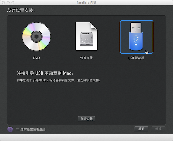 2、Parallels Desktop提供三種安裝介質(zhì)供用戶選擇:CD光盤、鏡像文件以及USB驅(qū)動(dòng)器。這里選擇“USB驅(qū)動(dòng)器(如何制作系統(tǒng)安裝U盤)”。點(diǎn)擊“繼續(xù)”,Parallels Desktop 自動(dòng)檢測(cè)到系統(tǒng)信息,單擊“繼續(xù)”,進(jìn)行下一步安裝。