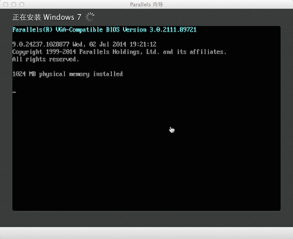 5、配置完成后Parallels向?qū)нM(jìn)入虛擬機(jī)BIOS啟動(dòng)界面并自動(dòng)開(kāi)始安裝Windows 7。熟悉的Windows 7安裝界面,稍等片刻,Windows7即能自主安裝成功。
