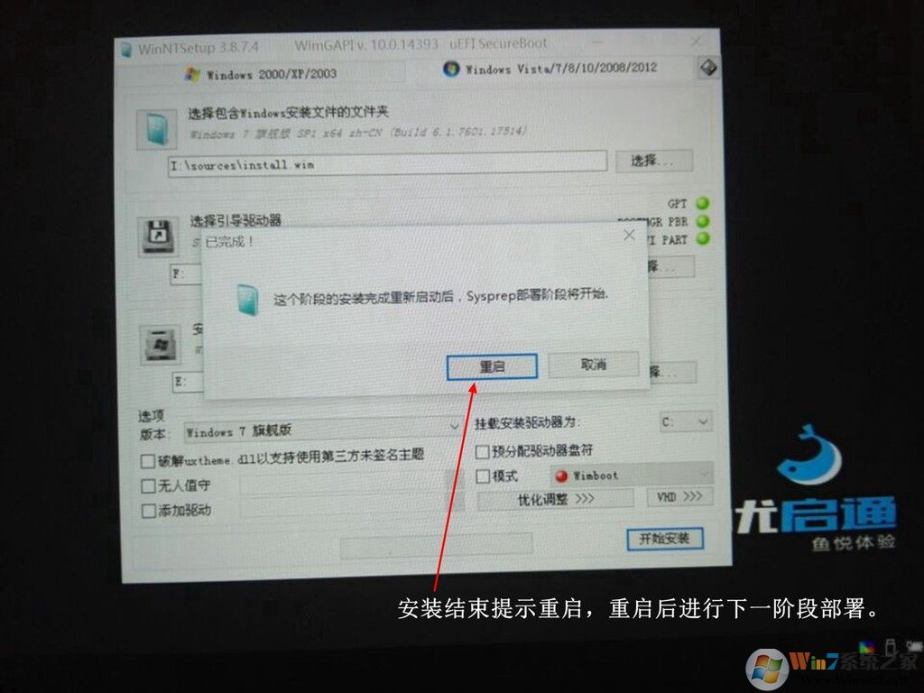 11、等待安裝結(jié)束提示重啟,重啟后進(jìn)行下一階段部署。如果安裝的是Win原版系統(tǒng)依據(jù)提示一步一步操作就可以,在這里就不重復(fù)贅述任何人都能搞定。