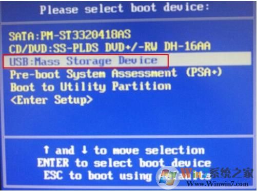 2、按下啟動(dòng)快捷鍵后系統(tǒng)進(jìn)入到啟動(dòng)項(xiàng)選擇窗口,利用鍵盤上的上下方向鍵選擇u盤啟動(dòng),其中USB開頭的就是插入的u盤,按下回車鍵確認(rèn),如圖所示:
