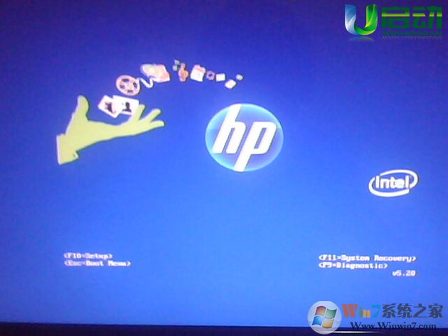 開啟電腦后當看到開機畫面的時候,連續(xù)按下鍵盤上的“F9”鍵,如下圖所示:為惠普電腦開機的畫面。(今天u啟動小編寫教程所用電腦一鍵u盤啟動的快捷鍵是F9)