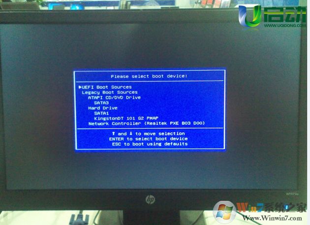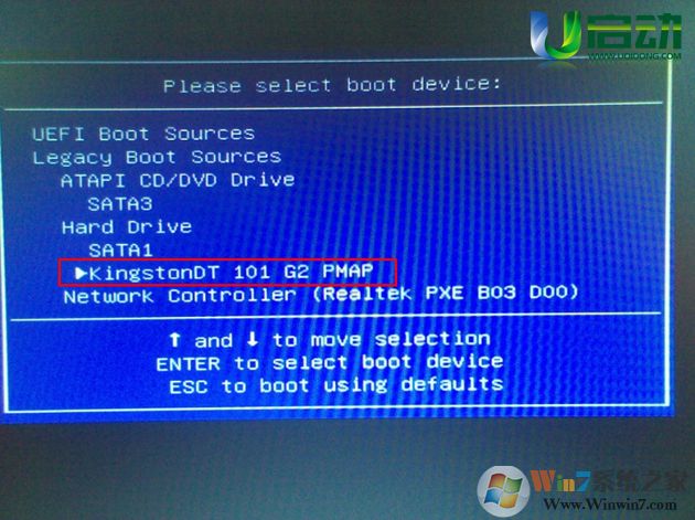 大家看下圖,將光標移動選擇到的地方顯示“KingtonDT 101 G2 PMAP”(u啟動小編寫這篇教程的時候使用的是u盤)所以,當我們按下快速熱鍵F9的時候顯示出來的選項中就包含有小編用u啟動制作好啟動盤的u盤。