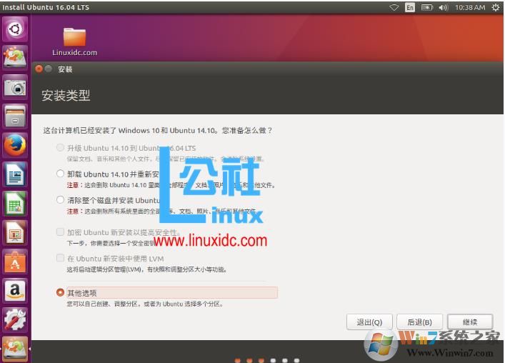5、如果是Windows與Linux雙系統(tǒng)安裝,請選擇其他選項,切記。您可以自己創(chuàng)建、調(diào)整分區(qū),或者為 Ubuntu 選擇多個分區(qū)。