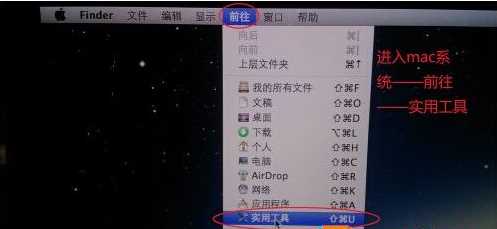3、在MAC系統(tǒng)中,點(diǎn)擊菜單上的【前往】—【實(shí)用工具】—【Boot Camp】如下圖;