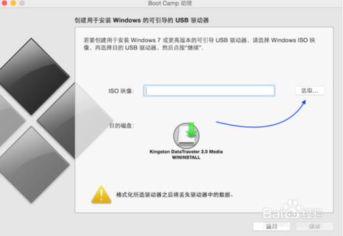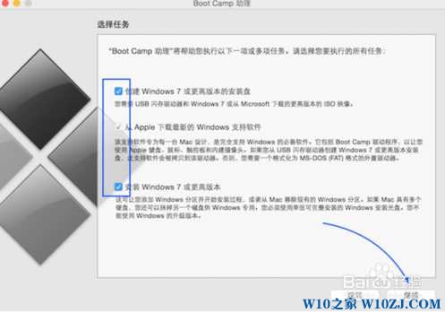 4、打開Boot Camp,然后勾選“創(chuàng)建Windows7安裝盤”,接著點(diǎn)繼續(xù);(此時你也可以勾選從Apple下載最新的Windows支持軟件,也就是驅(qū)動什么的,還有勾選安裝Windows或更高版本);