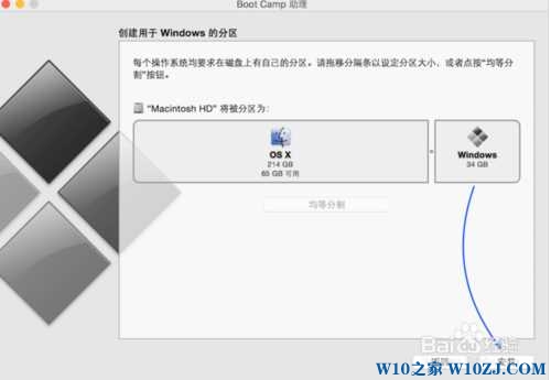 6、U 盤安裝盤制作完成以后,會進(jìn)入 Mac 硬盤的分割界面。在這里可以手動調(diào)整會 Windows 系統(tǒng)的硬盤空間。建議分配空間不少于 30G。
