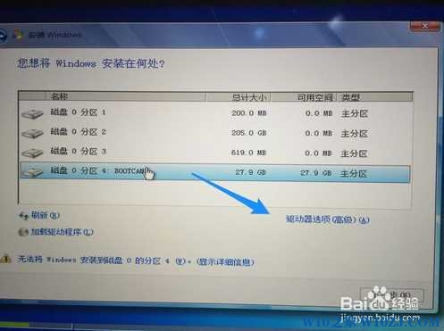 8、接下來在安裝系統(tǒng)分區(qū)界面里,選擇bootcamp分區(qū)并點(diǎn)擊“驅(qū)動器高級”選項(xiàng),如圖所示