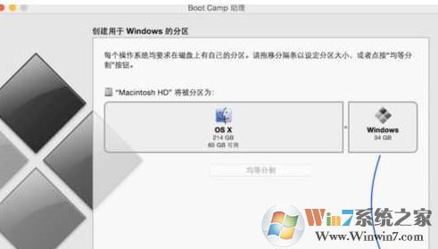 5、進(jìn)入 Mac 硬盤的分割界面。在這里可以手動(dòng)調(diào)整會(huì) Windows 系統(tǒng)的硬盤空間。這里我建議分大一點(diǎn),如果你主要使用Win7系統(tǒng)的話,因?yàn)檫€有儲(chǔ)存文件,如圖所示:
