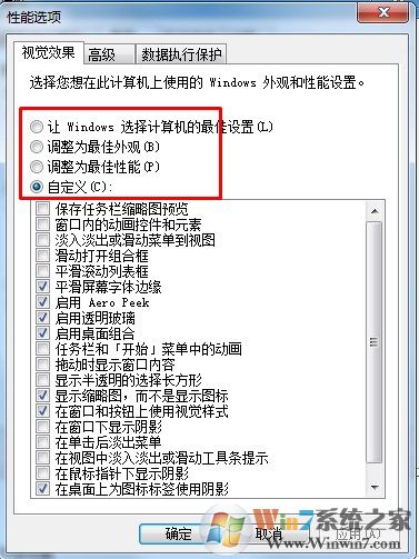 4、選折自己的側重方向,比如需要外觀美觀一點還是性能速度快一點,也可以自定義,不過小編還是希望大家使用win7系統(tǒng)自己推薦的設置