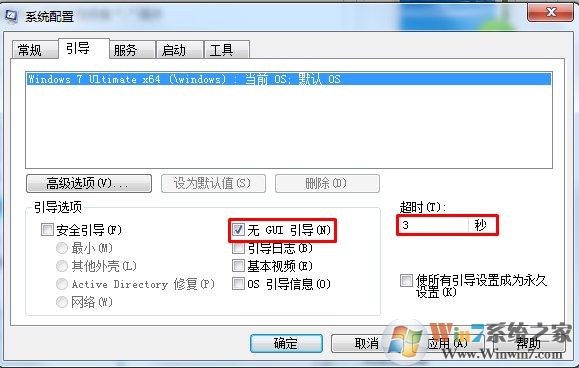 打開的系統(tǒng)設(shè)置界面頂端有五個選項卡,首先打開Boot(引導(dǎo))選項卡,修改Timeout(超時)為3秒(最小3秒);再把No GUI boot(無GUI引導(dǎo))選項選中。