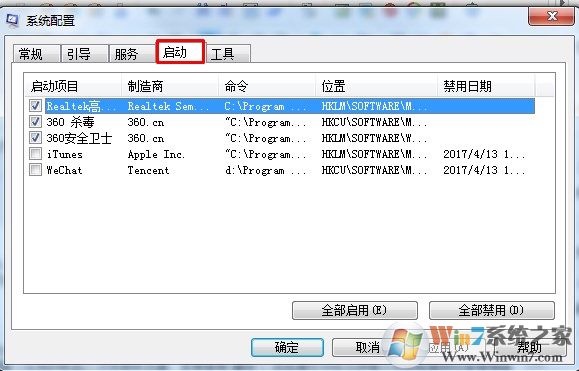 接下來打開另一個選項卡“啟動”,英文系統(tǒng)是Startup。點選不必要的啟動項前的復(fù)選框,如skype, 暴風(fēng)媒體中心,迅雷7等。然后點擊確認按鈕確認修改的內(nèi)容。之后系統(tǒng)可能提示重啟,我們暫時先不重新啟動。還要修改一個設(shè)置。