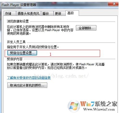 般瀏覽器這種問(wèn)題,一般是在控制面板->Flash Player->高級(jí)->受信任位置,添加相應(yīng)目錄或者文件,如圖中“1”所標(biāo)出的位置。即可解決問(wèn)題