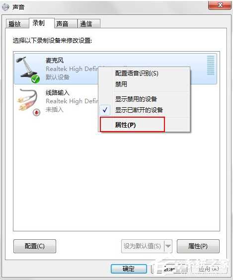 2、這時(shí)會(huì)出現(xiàn)一個(gè)“麥克風(fēng)”設(shè)備,右擊“麥克風(fēng)”,點(diǎn)擊“屬性”;